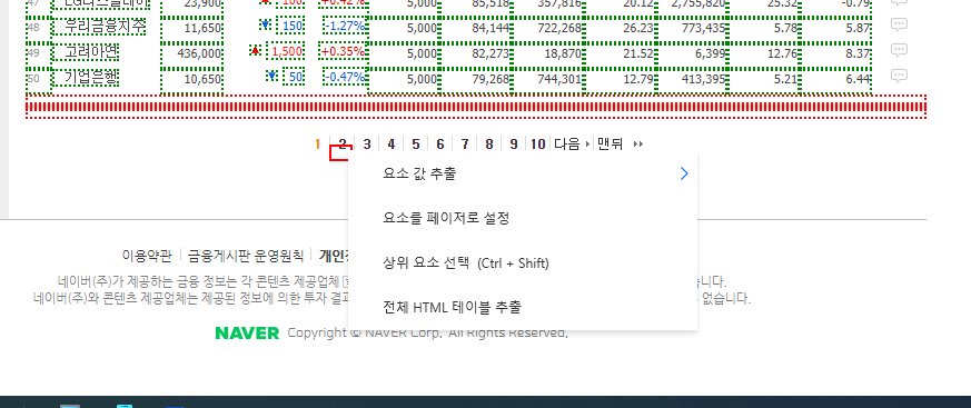100위까지 추출해야하니 2페이지까지 가야합니다. 페이징을 위해 스크롤을 하단으로 내려 2번 페이지 링크를 우측 버튼으로 클릭 > 요소를 페이저로 설정을 클릭합니다.