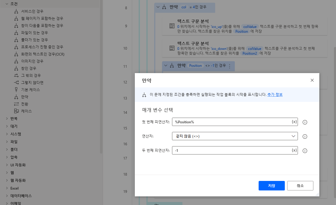 이제 ico_up인지 판단해야 합니다. 좌측 메뉴 조건 > 만약을 끌어와 아래와 같이 값을 입력합니다. 아래 조건문의 내용은 ico_up값이 -1이 아니라면 (즉, ico_up값이 있다면)으로 해석하면 됩니다.