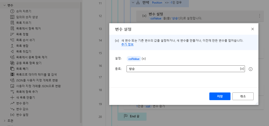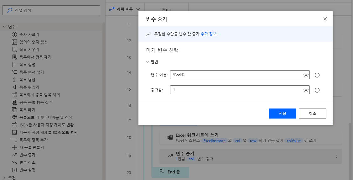 다음으로 2번째 반복문인 col 처리 반복문이 끝나기 전 col 변수를 1 증가시켜줍니다. 좌측 메뉴 변수 > 변수 증가를 끌어와 아래와 같이 저장합니다.