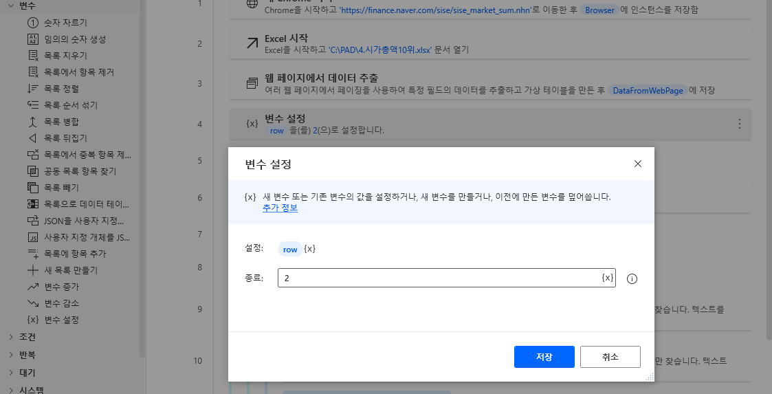 우선 좌측 메뉴 변수 > 변수 설정을 끌어와 변수명은 row, 값은 2로 행에 대한 변수를 저장합니다. 초기값이 2인 이유는 데이터를 넣으려는 엑셀의 1행은 이미 타이틀이 있기 때문에 2행부터 시작해야 합니다.