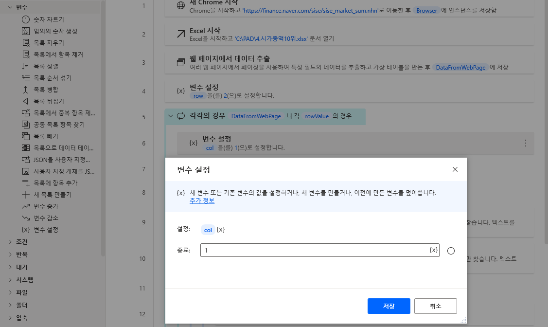 좌측 메뉴 변수 > 변수 설정을 끌어와 변수명은 col, 값은 1로 열에 대한 변수를 저장합니다.