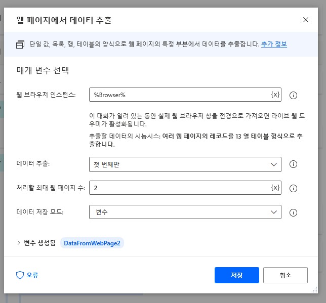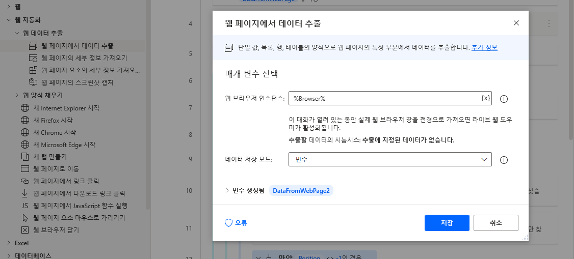 데이터 추출을 해야합니다. 좌측 웹 자동화 > 웹 데이터 추출 > 웹 페이지에서 데이터 추출을 끌어와 이전과 다르게 데이터 저장 모드를 변수로 선택합니다.
