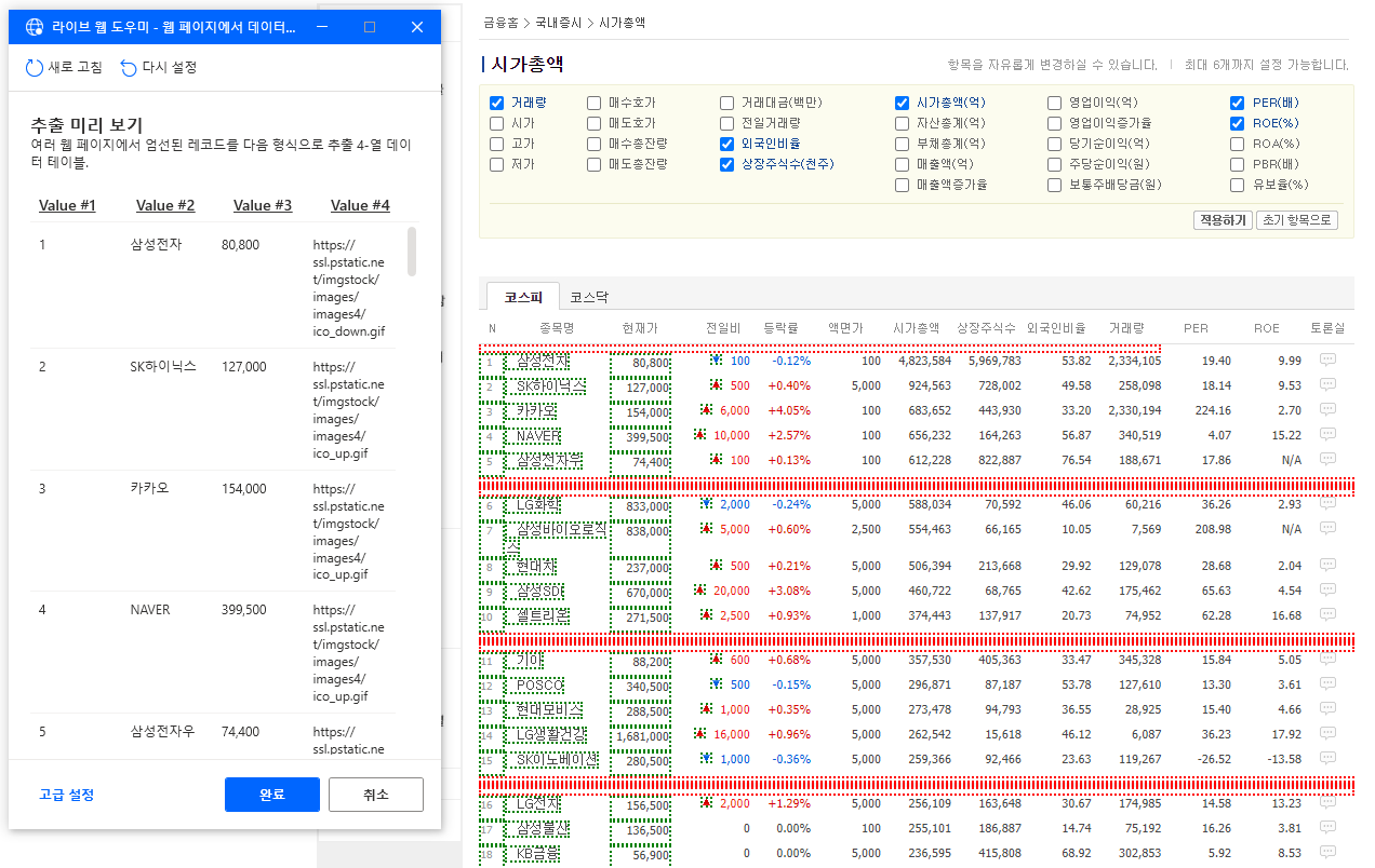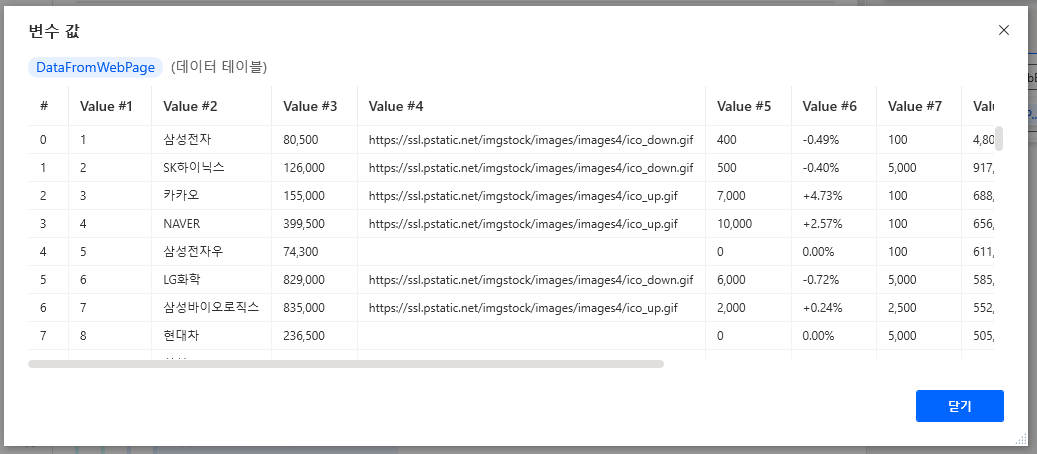 새로운 <tr>에 값을 추출하니 자동으로 <tr>반복으로 판단하여 해당 데이터를 다시 정렬하였습니다. 그리고 라이브 웹 도우미 화면을 보면 Value#4까지 데이터가 있고 웹 페이지 화면을 보면 4번째, 즉 전일비 아이콘까지 초록색 점선으로 Border처리 되어 있습니다. 이것으로 보면 초록색 Border 부분의 데이터가 추출된다라는 것을 알 수 있습니다.