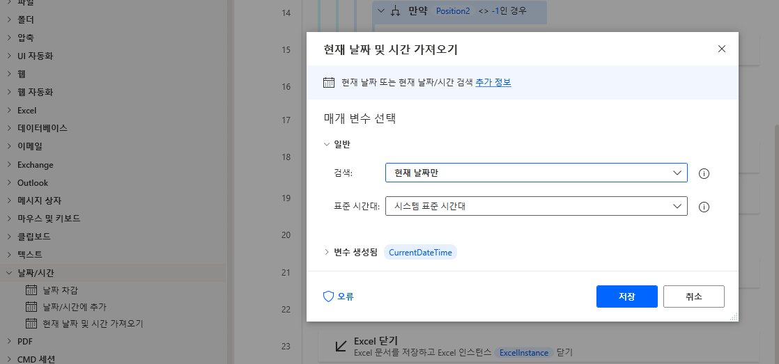 먼저 이메일에 보내는 날짜를 넣고 싶습니다. 만약 반복된 작업이라면 날짜로 구분해야하기 때문입니다. 좌측 메뉴 날짜/시간 > 현재 날짜 및 시간 가져오기를 끌어와 아래와 같이 선택하고 저장합니다.