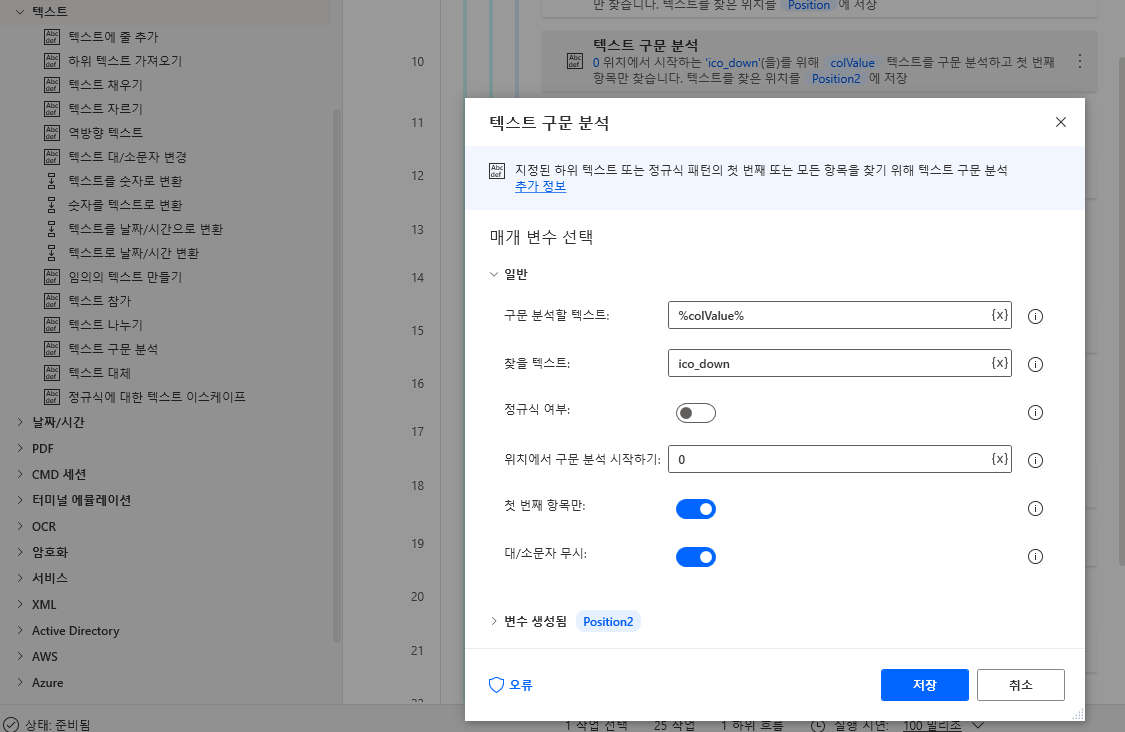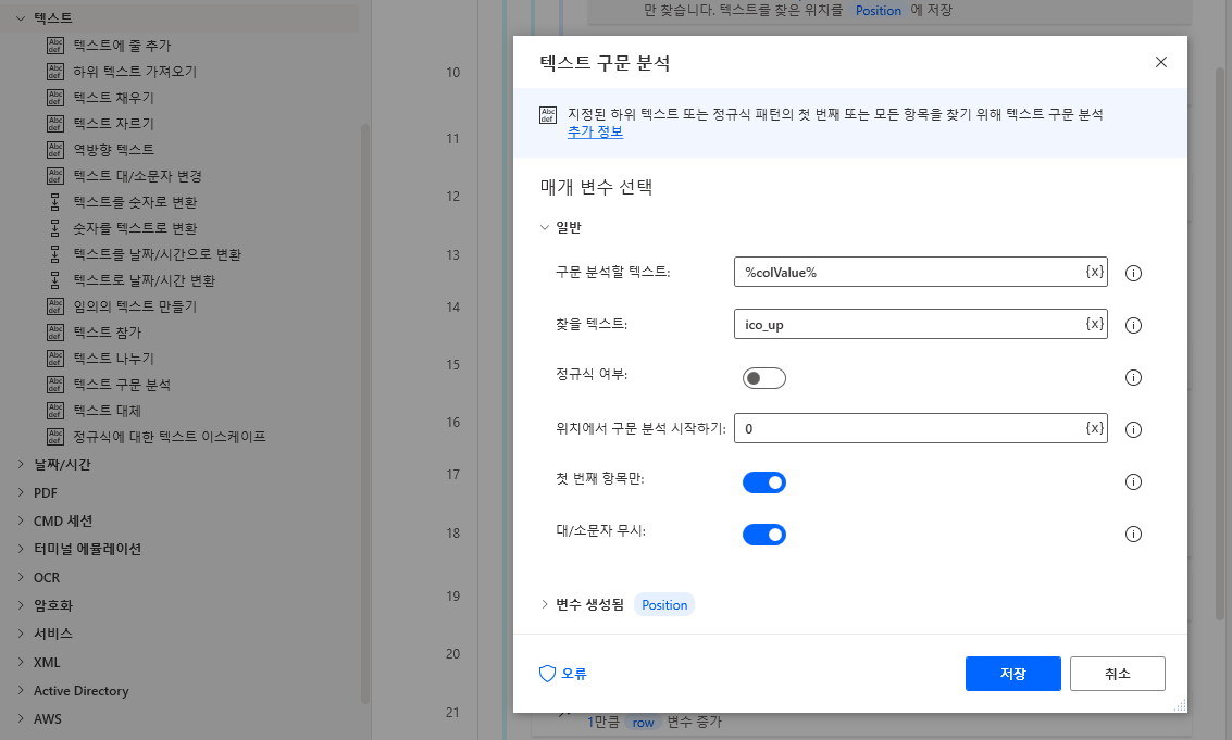 우선 좌측 메뉴 텍스트 > 텍스트 구문 분석을 끌어와 분석할 텍스트는 colValue, 찾을 텍스트는 ico_up을 입력합니다. 다음으로 구문 분석 시작하기는 colVauel의 몇번째 index부터 검색할지 index값을 넣는 부분으로 처음부터 하려면 0, 특정 index부터 검색하려면 해당 index를 입력하면 됩니다. 찾는 문자의 index가 가까울 수록 속도는 빨라집니다. 다음 첫번째 항목만 옵션은 ico_up이 첫번째로 나오는 index값을 변수에 저장하게 되며 체크를 해제하면 일치하는 모든 index값을 변수에 저장합니다.