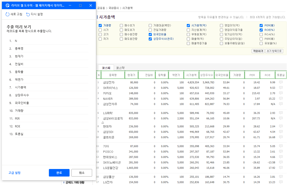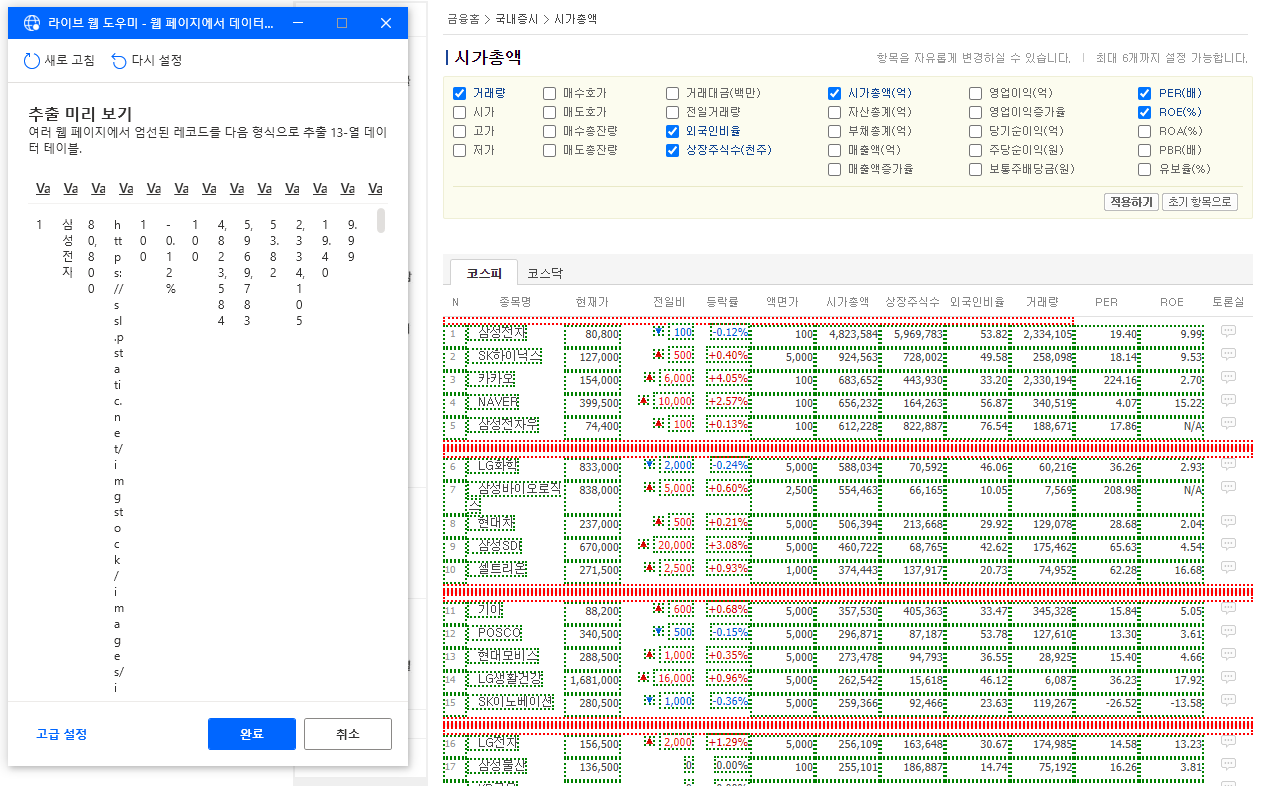 다음 종목명, 현재가를 위와 같은 방법으로 추출하면 자동으로 전체 행이 추출되어 표시됩니다.